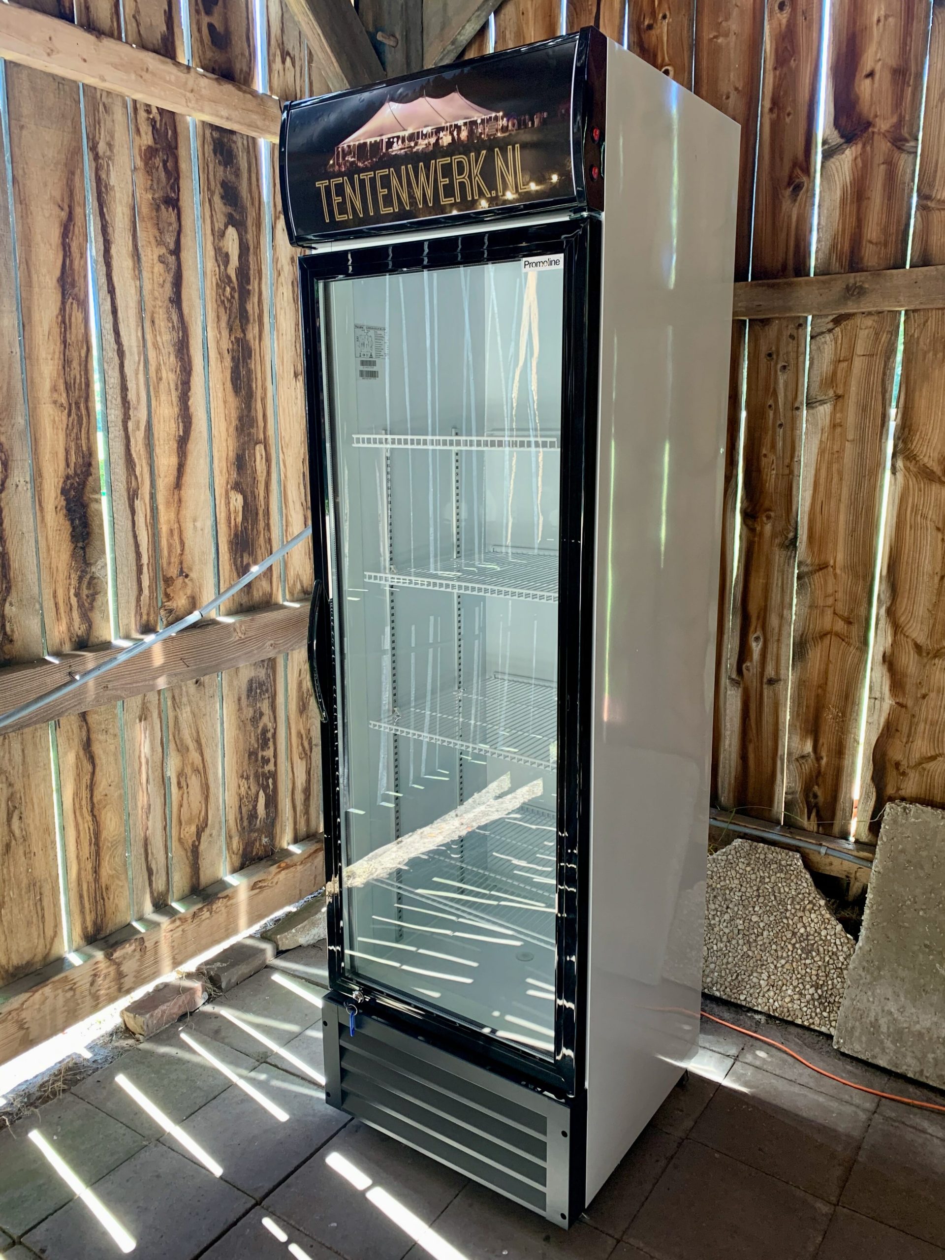 Mooie koelkast met glazen deur (hoog model) waaruit u uw gasten koele drankjes kunt serveren! De indeling van de leggers is naar eigen wens te wijzigen, bijvoorbeeld voor het liggend plaatsen van flessen of juist staand. De Tentenwerk-afbeelding bovenin kan desgewenst worden verwijderd en eventueel tegen meerprijs worden voorzien van uw eigen afbeelding / logo.