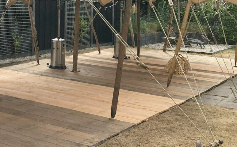 Passende vloer voor een 5x13m stretchtent, gemaakt van onze mooie douglas vloerdelen, die verstek gelegd worden. De douglas houten vloerdelen zijn 5 meter bij 40 centimeter en schuiven mooi in elkaar zodat een aaneengesloten vloer ontstaat. Een vlakke (of in ieder geval niet ál te hobbelige…) ondergrond zonder obstakels is vereist voor het leggen ervan: de vlonders liggen direct op de ondergrond, kleine verschillen in ondergrond kunnen worden opgevangen.