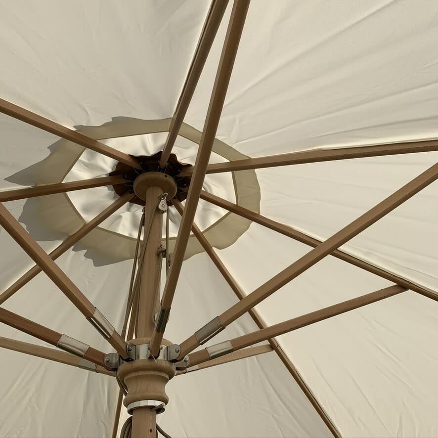 Luxe, witte parasol diameter 350cm met houten constructie, inclusief zware, houten voet van ongeveer 120 kg.