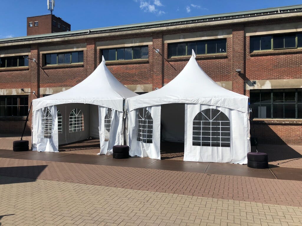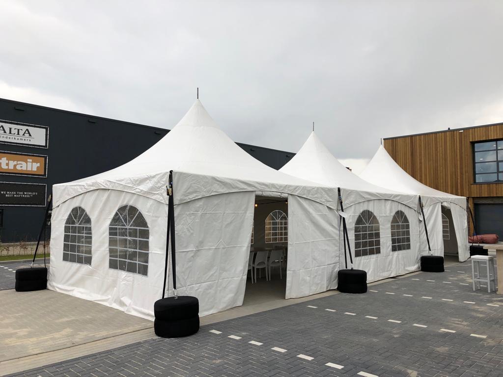 De topper onder de tenten. Een pagodetent, met name door zijn sierlijke, puntige dak, zorgt ervoor dat je gasten direct weten dat er iets te vieren valt of een mooi evenement te beleven is. Deze tent kan geschakeld worden aan andere pagodes, door middel van regengoten blijven je gasten dan ook droog. Zowel in een vierkant (met goot bij de vier middenpalen), naast elkaar, in een L- of U-vorm, maar net wat jouw evenement nodig heeft!
