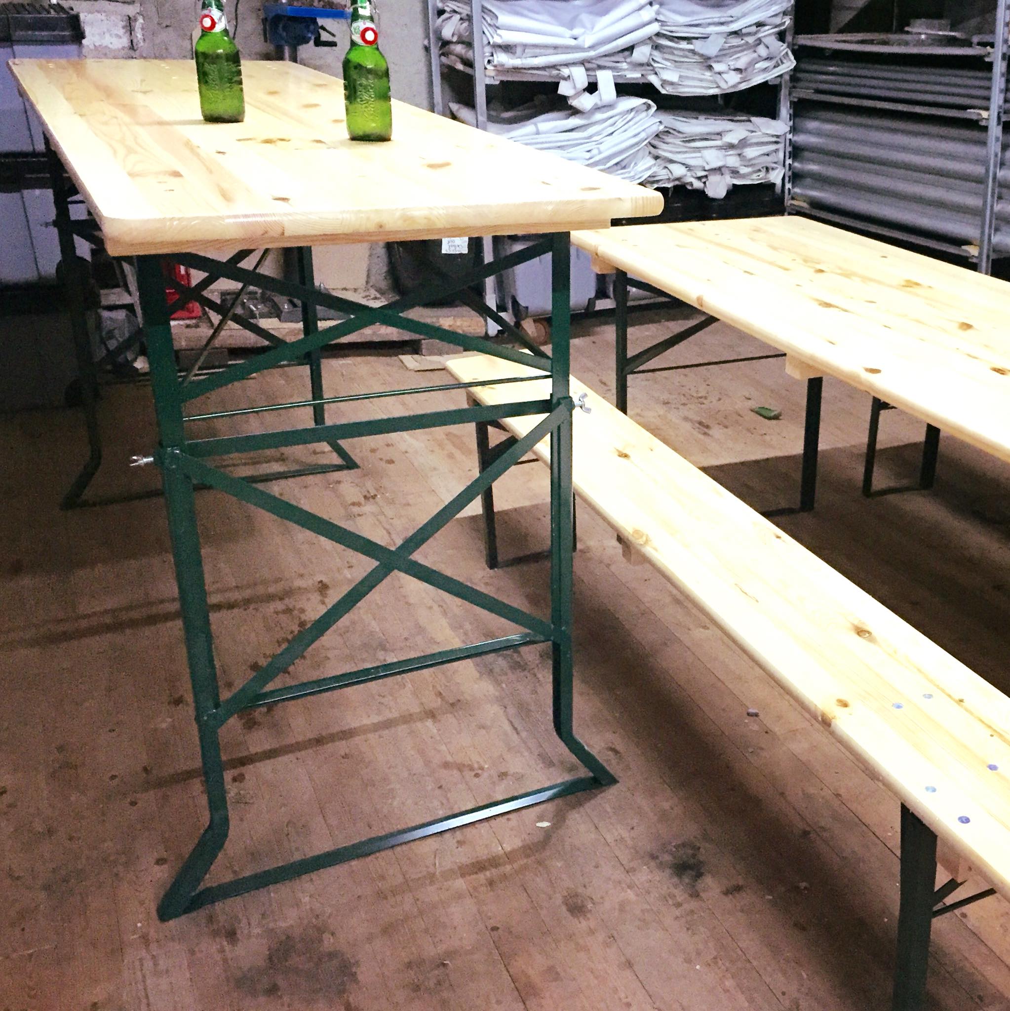 Mooie, houten tafel. Stevig: zware brouwerijkwaliteit, eventueel met onderin een bankje (niet op de foto) voor het relaxed neer kunnen zetten van je voeten.